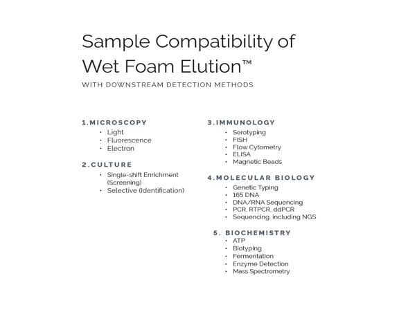 The one-pass method uses robust filtration followed by instant sample recovery using InnovaPrep's patented Wet Foam Elution™ process delivering a highly concentrated sample ideal for detection by culture, PCR, sequencing, and more – with unprecedented speed and efficiency. For applications needing rapid, reliable sample concentration, this system provides a faster, simpler alternative to traditional culture enrichment, centrifugation, and ultracentrifugation methods.